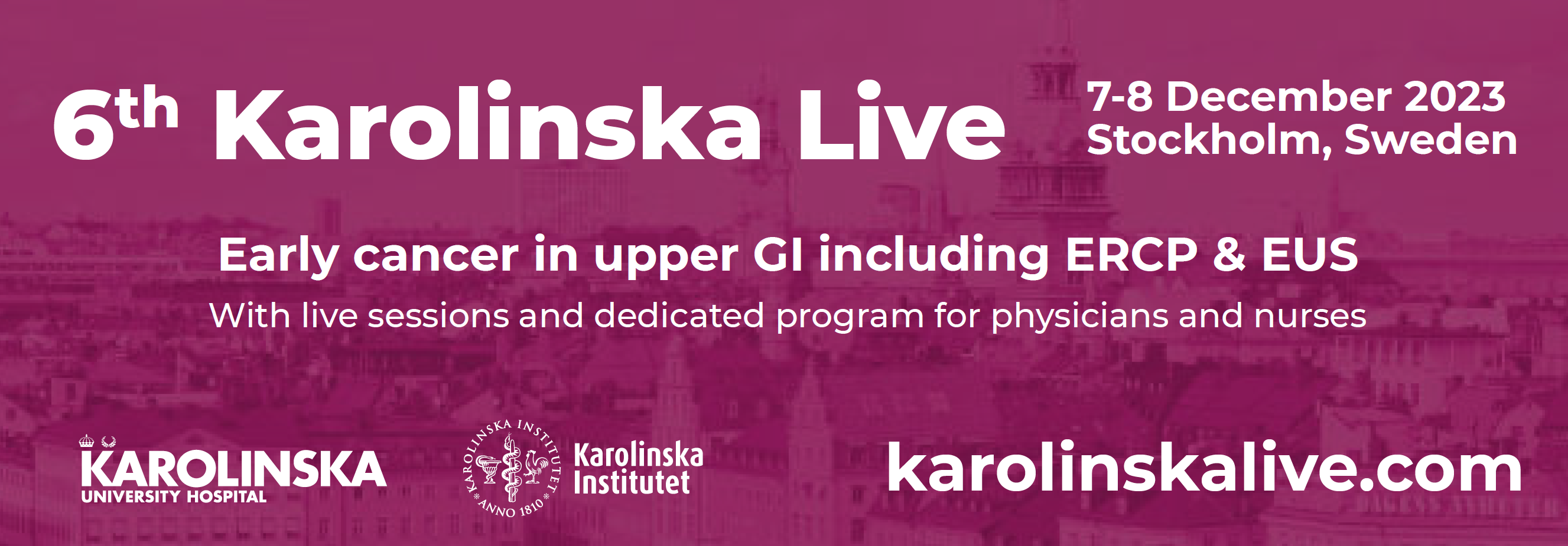 Eveniment nou!Colegii de la Karolinska University Hospital și Karolinska Institutet sunt încântați să gazduiasca al 6-lea Karolinska Live! event, care va avea loc pe 7 și 8 decembrie 2023 la Spitalul Universitar Karolinska din Stockholm. Programul din acest an este axat pe „Cancerul precoce din tub digestiv superior, inclusiv tehnici de ERCP și EUS”. Experți internaționali de top din întreaga lume vor demonstra cele mai recente progrese în tehnici de EUS și ERCP pentru tubul digestig superior. Vor fi demonstrații live ale tehnicilor endoscopice de bază în domeniu. Vor fi utilizate endoscoape si procesoare de ultimă generație și de asemenea vor avea loc demostratii live. Mai multe informații pot fi găsite la www.karolinskalive.com